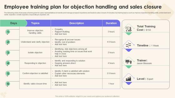 The following slide showcases a training plan for sales representatives to handle and manage prospect objections and leads to sales closure. It includes key training topics such as improve objection handling skills, understand and clarify objection, isolate objection, responding to objection, etc. From laying roadmaps to briefing everything in detail, our templates are perfect for you. You can set the stage with your presentation slides. All you have to do is download these easy to edit and customizable templates. Employee Training Plan For Objection Sales Performance Enhancement Mockup Pdf will help you deliver an outstanding performance that everyone would remember and praise you for. Do download this presentation today. The following slide showcases a training plan for sales representatives to handle and manage prospect objections and leads to sales closure. It includes key training topics such as improve objection handling skills, understand and clarify objection, isolate objection, responding to objection, etc.