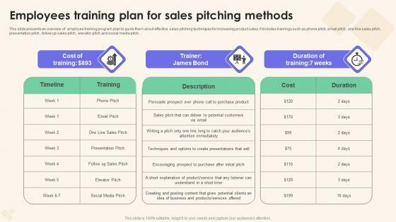 This slide presents an overview of employee training program plan to guide them about effective sales pitching techniques for increasing product sales. It includes trainings such as phone pitch, email pitch, one line sales pitch, presentation pitch, follow up sales pitch, elevator pitch and social media pitch. Slidegeeks is here to make your presentations a breeze with Performance Enhancement Plan Employees Training Plan For Sales Pitching Methods Information Pdf With our easy-to-use and customizable templates, you can focus on delivering your ideas rather than worrying about formatting. With a variety of designs to choose from, you are sure to find one that suits your needs. And with animations and unique photos, illustrations, and fonts, you can make your presentation pop. So whether you are giving a sales pitch or presenting to the board, make sure to check out Slidegeeks first. This slide presents an overview of employee training program plan to guide them about effective sales pitching techniques for increasing product sales. It includes trainings such as phone pitch, email pitch, one line sales pitch, presentation pitch, follow up sales pitch, elevator pitch and social media pitch.