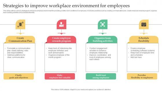 This slide outlines various strategies to improve workplace culture and environment. It includes practices such as encourage collaboration among employees, offer rewards and recognition, provide regular feedback, create a conducive work environment and build effective communication at workplace. Want to ace your presentation in front of a live audience Our Employer Branding Strategy For Competitive Best Practices To Enhance Organizational Background Pdf can help you do that by engaging all the users towards you. Slidegeeks experts have put their efforts and expertise into creating these impeccable powerpoint presentations so that you can communicate your ideas clearly. Moreover, all the templates are customizable, and easy-to-edit and downloadable. Use these for both personal and commercial use. This slide outlines various strategies to improve workplace culture and environment. It includes practices such as encourage collaboration among employees, offer rewards and recognition, provide regular feedback, create a conducive work environment and build effective communication at workplace.