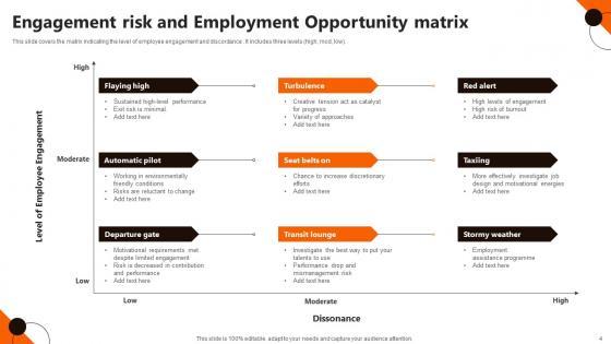 This slide covers the matrix indicating the level of employee engagement and discordance. It includes three levels high, mod, low. Pitch your topic with ease and precision using this Engagement Risk And Employment Opportunity Matrix Brochure Pdf. This layout presents information on Flaying High, Automatic Pilot, Transit Lounge. It is also available for immediate download and adjustment. So, changes can be made in the color, design, graphics or any other component to create a unique layout. This slide covers the matrix indicating the level of employee engagement and discordance. It includes three levels high, mod, low.
