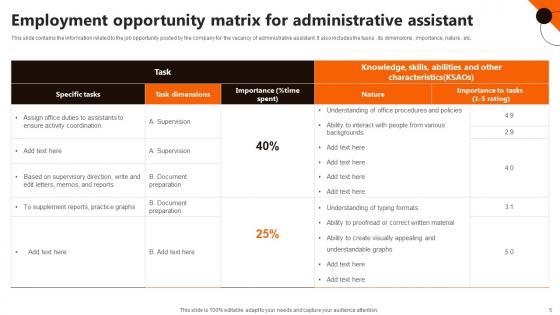 This slide contains the information related to the job opportunity posted by the company for the vacancy of administrative assistant. It also includes the tasks, its dimensions, importance, nature, etc. Showcasing this set of slides titled Employment Opportunity Matrix For Administrative Assistant Structure Pdf. The topics addressed in these templates are Specific Tasks, Task Dimensions. All the content presented in this PPT design is completely editable. Download it and make adjustments in color, background, font etc. as per your unique business setting. This slide contains the information related to the job opportunity posted by the company for the vacancy of administrative assistant. It also includes the tasks, its dimensions, importance, nature, etc.