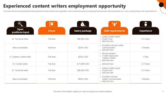 This slide covers the job opportunities for the experienced content writers in the organization. It also includes the various job openings technical writer, intern proofreader, etc., hours, salary package, skills requirements, etc. Showcasing this set of slides titled Experienced Content Writers Employment Opportunity Clipart Pdf. The topics addressed in these templates are Open, Positions Input, Hours, Salary Package. All the content presented in this PPT design is completely editable. Download it and make adjustments in color, background, font etc. as per your unique business setting. This slide covers the job opportunities for the experienced content writers in the organization. It also includes the various job openings technical writer, intern proofreader, etc., hours, salary package, skills requirements, etc.