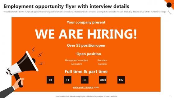 If designing a presentation takes a lot of your time and resources and you are looking for a better alternative, then this job offerings employment opportunity ppt powerpoint presentation complete deck is the right fit for you. This is a prefabricated set that can help you deliver a great presentation on the topic. All the twelve slides included in this sample template can be used to present a birds-eye view of the topic. These slides are also fully editable, giving you enough freedom to add specific details to make this layout more suited to your business setting. Apart from the content, all other elements like color, design, theme are also replaceable and editable. This helps in designing a variety of presentations with a single layout. Not only this, you can use this PPT design in formats like PDF, PNG, and JPG once downloaded. Therefore, without any further ado, download and utilize this sample presentation as per your liking.