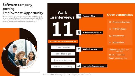 This slide shows the job posting by an organisation to fulfill the urgent vacancies for various developersfront-end, back-end, PHP and full stack. It also includes the timings and venue of interview with the number of vacancies open and extra benefits provided by the company. Showcasing this set of slides titled Software Company Posting Employment Opportunity Topics Pdf. The topics addressed in these templates are Days Working, Performance Incentives, Medical Insurance. All the content presented in this PPT design is completely editable. Download it and make adjustments in color, background, font etc. as per your unique business setting. This slide shows the job posting by an organisation to fulfill the urgent vacancies for various developersfront-end, back-end, PHP and full stack. It also includes the timings and venue of interview with the number of vacancies open and extra benefits provided by the company.