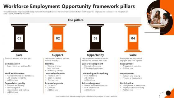 This slide contains the pillars of job design framework that helps to choose the combination of items that are best fit as per the employee and business needs. The pillars are core, support, opportunity and voice. Showcasing this set of slides titled Workforce Employment Opportunity Framework Pillars Summary Pdf. The topics addressed in these templates are Core, Support, Opportunity. All the content presented in this PPT design is completely editable. Download it and make adjustments in color, background, font etc. as per your unique business setting. This slide contains the pillars of job design framework that helps to choose the combination of items that are best fit as per the employee and business needs. The pillars are core, support, opportunity and voice.