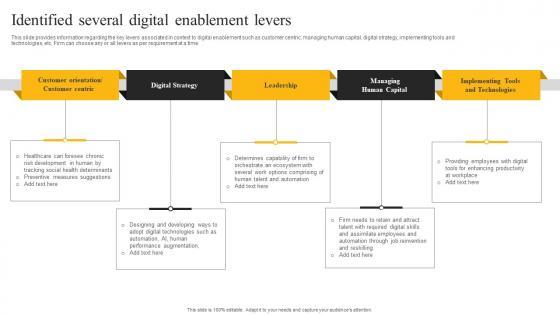 This slide provides information regarding the key levers associated in context to digital enablement such as customer centric, managing human capital, digital strategy, implementing tools and technologies, etc. Firm can choose any or all levers as per requirement at a time. Crafting an eye-catching presentation has never been more straightforward. Let your presentation shine with this tasteful yet straightforward Identified Several Digital Enablement Levers E Sales Generation Checklist Designs PDF template. It offers a minimalistic and classy look that is great for making a statement. The colors have been employed intelligently to add a bit of playfulness while still remaining professional. Construct the ideal Identified Several Digital Enablement Levers E Sales Generation Checklist Designs PDF that effortlessly grabs the attention of your audience Begin now and be certain to wow your customers This slide provides information regarding the key levers associated in context to digital enablement such as customer centric, managing human capital, digital strategy, implementing tools and technologies, etc. Firm can choose any or all levers as per requirement at a time.