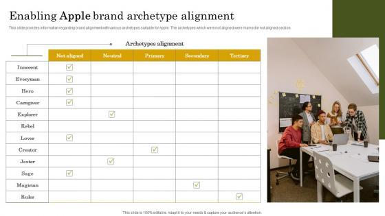 This slide provides information regarding brand alignment with various archetypes suitable for Apple. The archetypes which were not aligned were marked in not aligned section. Welcome to our selection of the Enabling Apple Brand Archetype Apple Brand Story Journey Of Iconic Enterprise Graphics Pdf. These are designed to help you showcase your creativity and bring your sphere to life. Planning and Innovation are essential for any business that is just starting out. This collection contains the designs that you need for your everyday presentations. All of our PowerPoints are 100 percent editable, so you can customize them to suit your needs. This multi purpose template can be used in various situations. Grab these presentation templates today This slide provides information regarding brand alignment with various archetypes suitable for Apple. The archetypes which were not aligned were marked in not aligned section.