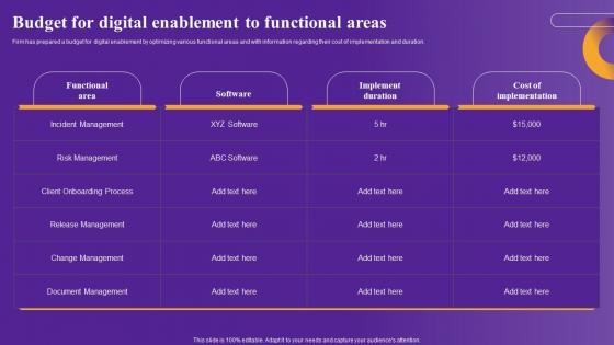 Firm has prepared a budget for digital enablement by optimizing various functional areas and with information regarding their cost of implementation and duration. Take your projects to the next level with our ultimate collection of Framework For Digital Transformation And Modernization Budget For Digital Enablement To Functional Portrait PDF. Slidegeeks has designed a range of layouts that are perfect for representing task or activity duration, keeping track of all your deadlines at a glance. Tailor these designs to your exact needs and give them a truly corporate look with your own brand colors they will make your projects stand out from the rest.