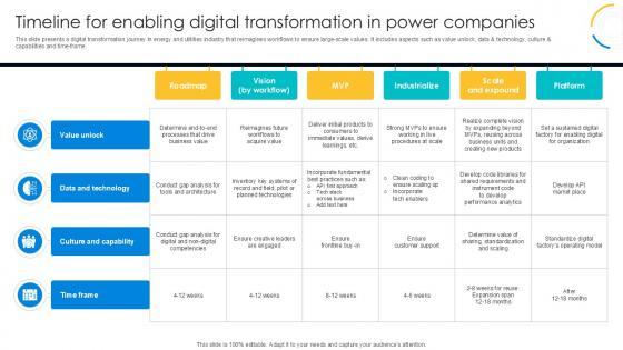 This slide presents a digital transformation journey in energy and utilities industry that reimagines workflows to ensure large-scale values. It includes aspects such as value unlock, data and technology, culture and capabilities and time-frame. Do you know about Slidesgeeks Data And Technology, Culture And Capability, Time Frame These are perfect for delivering any kind od presentation. Using it, create PowerPoint presentations that communicate your ideas and engage audiences. Save time and effort by using our pre-designed presentation templates that are perfect for a wide range of topic. Our vast selection of designs covers a range of styles, from creative to business, and are all highly customizable and easy to edit. Download as a PowerPoint template or use them as Google Slides themes. This slide presents a digital transformation journey in energy and utilities industry that reimagines workflows to ensure large-scale values. It includes aspects such as value unlock, data and technology, culture and capabilities and time-frame.