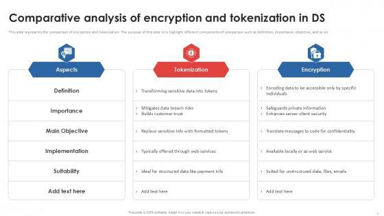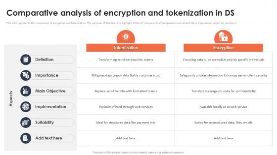 This slide represents the comparison of encryption and tokenization. The purpose of this slide is to highlight different components of comparison such as definition, importance, objective. Boost your pitch with our creative Comparative Analysis Of Encryption And Tokenization In Ds PPT Template. Deliver an awe-inspiring pitch that will mesmerize everyone. Using these presentation templates you will surely catch everyones attention. You can browse the ppts collection on our website. We have researchers who are experts at creating the right content for the templates. So you do not have to invest time in any additional work. Just grab the template now and use them. This slide represents the comparison of encryption and tokenization. The purpose of this slide is to highlight different components of comparison such as definition, importance, objective, and so on