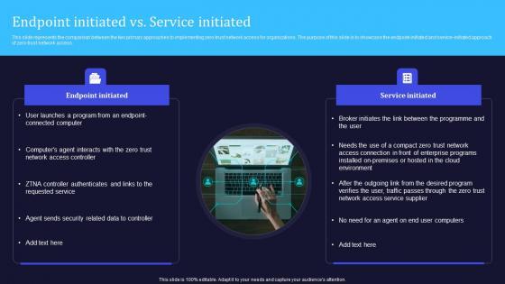 This slide represents the comparison between the two primary approaches to implementing zero-trust network access for organizations. The purpose of this slide is to showcase the endpoint-initiated and service-initiated approach of zero-trust network access. Crafting an eye-catching presentation has never been more straightforward. Let your presentation shine with this tasteful yet straightforward Zero Trust Model Endpoint Initiated Vs Service Initiated template. It offers a minimalistic and classy look that is great for making a statement. The colors have been employed intelligently to add a bit of playfulness while still remaining professional. Construct the ideal Zero Trust Model Endpoint Initiated Vs Service Initiated that effortlessly grabs the attention of your audience Begin now and be certain to wow your customers. This slide represents the comparison between the two primary approaches to implementing zero-trust network access for organizations. The purpose of this slide is to showcase the endpoint-initiated and service-initiated approach of zero-trust network access.