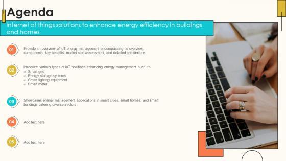 Find a pre-designed and impeccable Agenda Internet Of Things Solutions To Enhance Energy Efficiency In Buildings And Homes IoT SS V. The templates can ace your presentation without additional effort. You can download these easy-to-edit presentation templates to make your presentation stand out from others. So, what are you waiting for Download the template from Slidegeeks today and give a unique touch to your presentation. Our Agenda Internet Of Things Solutions To Enhance Energy Efficiency In Buildings And Homes IoT SS V are topically designed to provide an attractive backdrop to any subject. Use them to look like a presentation pro.