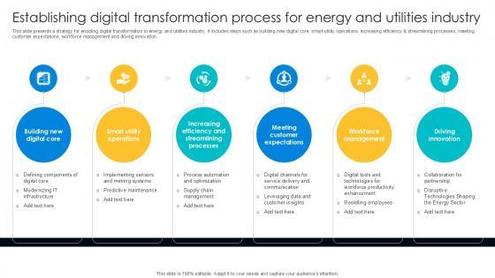 This slide presents a strategy for enabling digital transformation in energy and utilities industry. It includes steps such as building new digital core, smart utility operations, increasing efficiency and streamlining processes, meeting customer expectations, workforce management and driving innovation. Coming up with a presentation necessitates that the majority of the effort goes into the content and the message you intend to convey. The visuals of a PowerPoint presentation can only be effective if it supplements and supports the story that is being told. Keeping this in mind our experts created Establishing Digital Transformation Process For Energy And Utilities Industry PPT Slide DT SS V to reduce the time that goes into designing the presentation. This way, you can concentrate on the message while our designers take care of providing you with the right template for the situation. This slide presents a strategy for enabling digital transformation in energy and utilities industry. It includes steps such as building new digital core, smart utility operations, increasing efficiency and streamlining processes, meeting customer expectations, workforce management and driving innovation.