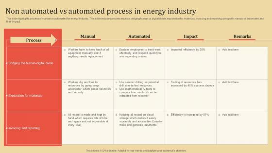 This slide highlights process of manual vs automated for energy industry. This slide includes process such as bridging human vs digital divide, exploration for materials, invoicing and reporting along with manual vs automated and their impact.Showcasing this set of slides titled Non Automated Vs Automated Process In Energy Industry Download PDF The topics addressed in these templates are Human Digital Divide, Exploration Materials, Invoicing Reporting All the content presented in this PPT design is completely editable. Download it and make adjustments in color, background, font etc. as per your unique business setting. This slide highlights process of manual vs automated for energy industry. This slide includes process such as bridging human vs digital divide, exploration for materials, invoicing and reporting along with manual vs automated and their impact.