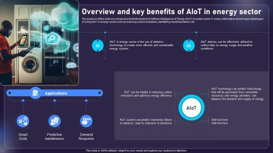 The purpose of this slide is to showcase brief introduction to Artificial Intelligence of Things AIoT in power sector. It covers information about major advantages of using AIoT in energy sector such as reducing carbon emissions, identifying machinery failure, etc. Find a pre-designed and impeccable Overview And Key Benefits Of AIOT In Energy Sector AIOT Applications For Various Industries IoT SS V. The templates can ace your presentation without additional effort. You can download these easy-to-edit presentation templates to make your presentation stand out from others. So, what are you waiting for Download the template from Slidegeeks today and give a unique touch to your presentation. The purpose of this slide is to showcase brief introduction to Artificial Intelligence of Things AIoT in power sector. It covers information about major advantages of using AIoT in energy sector such as reducing carbon emissions, identifying machinery failure, etc.
