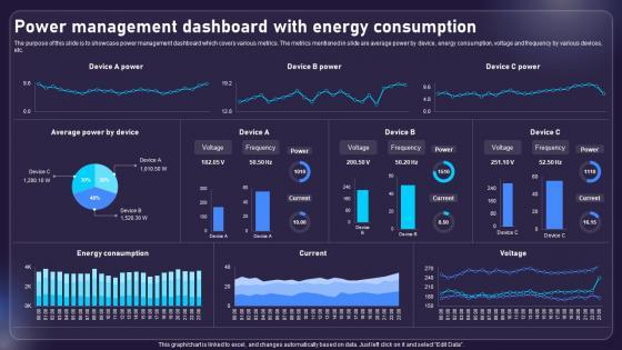 The purpose of this slide is to showcase power management dashboard which covers various metrics. The metrics mentioned in slide are average power by device, energy consumption, voltage and frequency by various devices, etc. Do you have to make sure that everyone on your team knows about any specific topic I yes, then you should give Power Management Dashboard With Energy Consumption AIOT Applications For Various Industries IoT SS V a try. Our experts have put a lot of knowledge and effort into creating this impeccable Power Management Dashboard With Energy Consumption AIOT Applications For Various Industries IoT SS V. You can use this template for your upcoming presentations, as the slides are perfect to represent even the tiniest detail. You can download these templates from the Slidegeeks website and these are easy to edit. So grab these today The purpose of this slide is to showcase power management dashboard which covers various metrics. The metrics mentioned in slide are average power by device, energy consumption, voltage and frequency by various devices, etc.