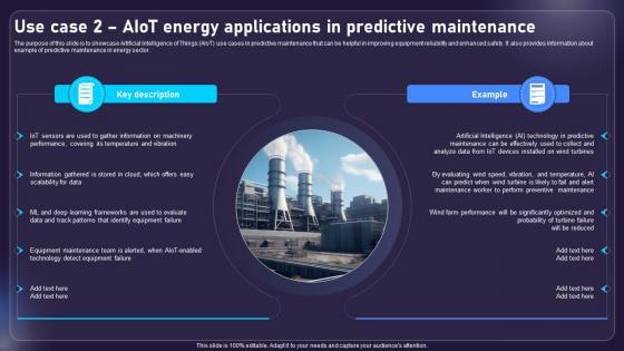 The purpose of this slide is to showcase Artificial Intelligence of Things AIoT use cases in predictive maintenance that can be helpful in improving equipment reliability and enhanced safety. It also provides information about example of predictive maintenance in energy sector. The best PPT templates are a great way to save time, energy, and resources. Slidegeeks have 100 percent editable powerpoint slides making them incredibly versatile. With these quality presentation templates, you can create a captivating and memorable presentation by combining visually appealing slides and effectively communicating your message. Download Use Case 2 AIOT Energy Applications In Predictive Maintenance AIOT Applications For Various Industries IoT SS V from Slidegeeks and deliver a wonderful presentation. The purpose of this slide is to showcase Artificial Intelligence of Things AIoT use cases in predictive maintenance that can be helpful in improving equipment reliability and enhanced safety. It also provides information about example of predictive maintenance in energy sector.