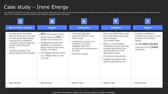 This slide talks about the case study carried out at Irene Energy organization. The purpose of this slide is to demonstrate how this corporation uses confidential computing technologies to provide electricity to remote American areas. The case study includes issues experienced, objectives, provided solutions and impact. Create an editable Case Study Irene Energy Secure Multi Party Sample Pdf that communicates your idea and engages your audience. Whether you are presenting a business or an educational presentation, pre-designed presentation templates help save time. Case Study Irene Energy Secure Multi Party Sample Pdf is highly customizable and very easy to edit, covering many different styles from creative to business presentations. Slidegeeks has creative team members who have crafted amazing templates. So, go and get them without any delay. This slide talks about the case study carried out at Irene Energy organization. The purpose of this slide is to demonstrate how this corporation uses confidential computing technologies to provide electricity to remote American areas. The case study includes issues experienced, objectives, provided solutions and impact.