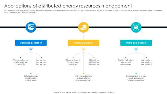 This slide showcases applications of incorporating DER Management applications into supply chain strategies that empowers energy and utilities companies to adapt to changing energy dynamics. It includes optimized generation, demand response, and micro-grid generation. Present like a pro with Applications Of Distributed Energy Digital Transformation Journey PPT Slide DT SS V. Create beautiful presentations together with your team, using our easy-to-use presentation slides. Share your ideas in real-time and make changes on the fly by downloading our templates. So whether you are in the office, on the go, or in a remote location, you can stay in sync with your team and present your ideas with confidence. With Slidegeeks presentation got a whole lot easier. Grab these presentations today. This slide showcases applications of incorporating DER Management applications into supply chain strategies that empowers energy and utilities companies to adapt to changing energy dynamics. It includes optimized generation, demand response, and micro-grid generation.