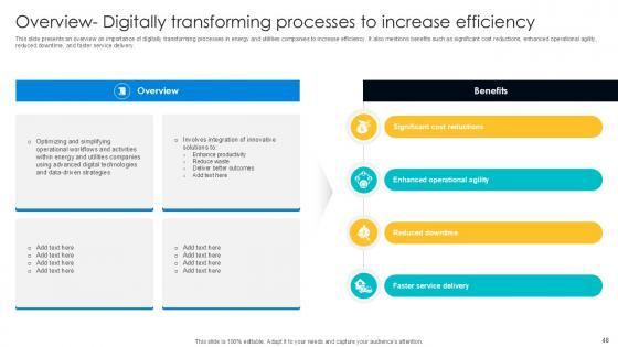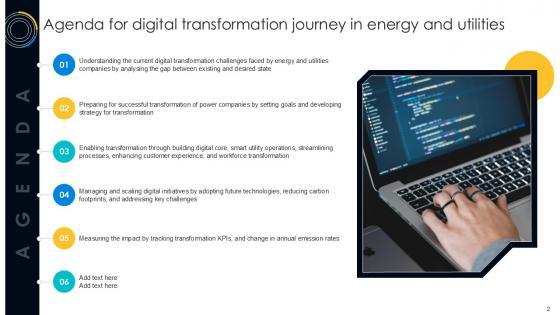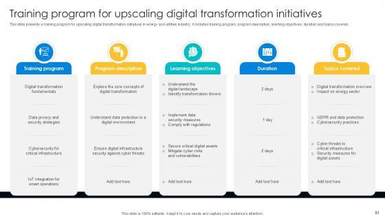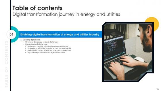 This Digital Transformation Journey In Energy And Utilities Ppt Sample DT CD V is designed to help you retain your audiences attention. This content-ready PowerPoint Template enables you to take your audience on a journey and share information in a way that is easier to recall. It helps you highlight the crucial parts of your work so that the audience does not get saddled with information download. This one hundred -slide PPT Deck comes prepared with the graphs and charts you could need to showcase your information through visuals. You only need to enter your own data in them. Download this editable PowerPoint Theme and walk into that meeting with confidence. Our Digital Transformation Journey In Energy And Utilities Ppt Sample DT CD V are topically designed to provide an attractive backdrop to any subject. Use them to look like a presentation pro.