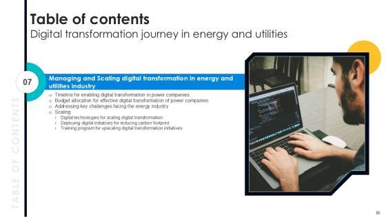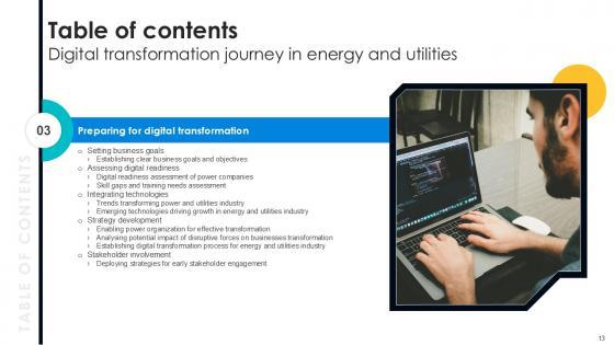 This Integrating Technologies, Strategy Development, Stakeholder Involvement from Slidegeeks makes it easy to present information on your topic with precision. It provides customization options, so you can make changes to the colors, design, graphics, or any other component to create a unique layout. It is also available for immediate download, so you can begin using it right away. Slidegeeks has done good research to ensure that you have everything you need to make your presentation stand out. Make a name out there for a brilliant performance. Our Table Of Content Digital Transformation Journey In Energy And Utilities PPT Template DT SS V are topically designed to provide an attractive backdrop to any subject. Use them to look like a presentation pro.