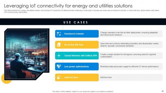 This slide presents how energy and utilities industry can leverage IoT connectivity for efficient remote monitoring of smart grids. It includes use cases such as freedom to transfer, no active SIM fees, global network with unified APN, and low power optimization. Crafting an eye-catching presentation has never been more straightforward. Let your presentation shine with this tasteful yet straightforward Low Power Optimizations, No Active SIM Fees, Freedom To Transfer template. It offers a minimalistic and classy look that is great for making a statement. The colors have been employed intelligently to add a bit of playfulness while still remaining professional. Construct the ideal Low Power Optimizations, No Active SIM Fees, Freedom To Transfer that effortlessly grabs the attention of your audience Begin now and be certain to wow your customers This slide presents how energy and utilities industry can leverage IoT connectivity for efficient remote monitoring of smart grids. It includes use cases such as freedom to transfer, no active SIM fees, global network with unified APN, and low power optimization.