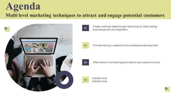 From laying roadmaps to briefing everything in detail, our templates are perfect for you. You can set the stage with your presentation slides. All you have to do is download these easy-to-edit and customizable templates. Agenda Multi Level Marketing Techniques To Attract And Engage Potential Customers Background Pdf will help you deliver an outstanding performance that everyone would remember and praise you for. Do download this presentation today. Our Agenda Multi Level Marketing Techniques To Attract And Engage Potential Customers Background Pdf are topically designed to provide an attractive backdrop to any subject. Use them to look like a presentation pro.