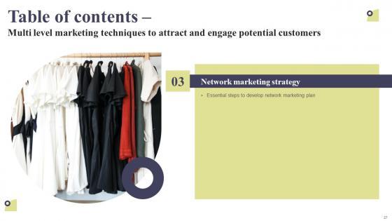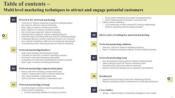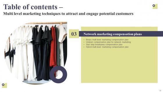From laying roadmaps to briefing everything in detail, our templates are perfect for you. You can set the stage with your presentation slides. All you have to do is download these easy-to-edit and customizable templates. Table Of Contents Multi Level Marketing Techniques To Attract And Engage Template Pdf will help you deliver an outstanding performance that everyone would remember and praise you for. Do download this presentation today. Our Table Of Contents Multi Level Marketing Techniques To Attract And Engage Template Pdf are topically designed to provide an attractive backdrop to any subject. Use them to look like a presentation pro.