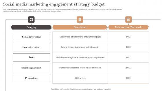 This slide outlines the social media marketing estimate cost that based on the effectiveness and performance of social media marketing plan. It includes various budget category such as social advertising, content creation, tools, social engagement and promotions. Pitch your topic with ease and precision using this Social Media Marketing Engagement Strategy Budget Ppt Pictures Objects Pdf. This layout presents information on Social Advertising, Content Creation, Tools, Social Engagement. It is also available for immediate download and adjustment. So, changes can be made in the color, design, graphics or any other component to create a unique layout. This slide outlines the social media marketing estimate cost that based on the effectiveness and performance of social media marketing plan. It includes various budget category such as social advertising, content creation, tools, social engagement and promotions.