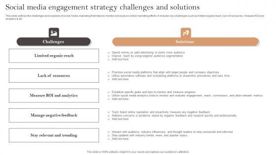 This slide outlines the challenges and solutions of social media marketing that helps to monitor and analyse online marketing efforts. It includes key challenges such as limited organic reach, lack of resources, measure ROI and analytics and etc. Pitch your topic with ease and precision using this Social Media Engagement Strategy Challenges And Solutions Ppt Gallery Vector Pdf. This layout presents information on Limited Organic Reach, Lack Resources, Measure ROI. It is also available for immediate download and adjustment. So, changes can be made in the color, design, graphics or any other component to create a unique layout. This slide outlines the challenges and solutions of social media marketing that helps to monitor and analyse online marketing efforts. It includes key challenges such as limited organic reach, lack of resources, measure ROI and analytics and etc.
