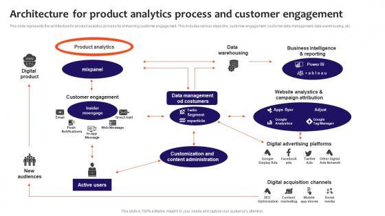 This slide represents the architecture for product analytics process for enhancing customer engagement. This includes various steps like, customer engagement, customer data management, data warehousing, etc. Pitch your topic with ease and precision using this Architecture For Product Analytics Process And Customer Engagement Elements Pdf. This layout presents information on Customer Engagement, Product Analytics, Data Management. It is also available for immediate download and adjustment. So, changes can be made in the color, design, graphics or any other component to create a unique layout. This slide represents the architecture for product analytics process for enhancing customer engagement. This includes various steps like, customer engagement, customer data management, data warehousing, etc.