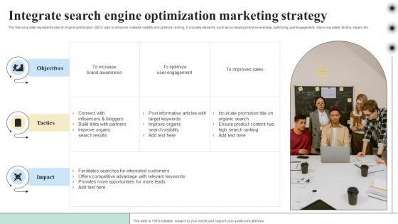 The following slide represents search engine optimization SEO plan to enhance website visibility and optimize ranking. It includes elements such as increasing brand awareness, optimizing user engagement, improving sales, tactics, impact etc. Formulating a presentation can take up a lot of effort and time, so the content and message should always be the primary focus. The visuals of the PowerPoint can enhance the presenters message, so our Integrate Search Engine Optimization Objectives And Key Result Methodology For Business was created to help save time. Instead of worrying about the design, the presenter can concentrate on the message while our designers work on creating the ideal templates for whatever situation is needed. Slidegeeks has experts for everything from amazing designs to valuable content, we have put everything into Integrate Search Engine Optimization Objectives And Key Result Methodology For Business The following slide represents search engine optimization SEO plan to enhance website visibility and optimize ranking. It includes elements such as increasing brand awareness, optimizing user engagement, improving sales, tactics, impact etc.