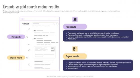 This showcases comparative assessment that can help advertise to differentiate between paid and organic search search.Paid results are quick way to rank on search engine and organic results takes time to rank on result page. Here you can discover an assortment of the finest PowerPoint and Google Slides templates. With these templates, you can create presentations for a variety of purposes while simultaneously providing your audience with an eye-catching visual experience. Download Strategic Performance Marketing Campaign Organic Vs Paid Search Engine Results Formats Pdf to deliver an impeccable presentation. These templates will make your job of preparing presentations much quicker, yet still, maintain a high level of quality. Slidegeeks has experienced researchers who prepare these templates and write high-quality content for you. Later on, you can personalize the content by editing the Strategic Performance Marketing Campaign Organic Vs Paid Search Engine Results Formats Pdf. This showcases comparative assessment that can help advertise to differentiate between paid and organic search search.Paid results are quick way to rank on search engine and organic results takes time to rank on result page.