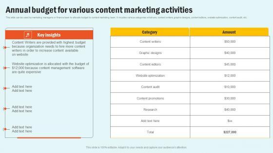 This slide can be used by marketing managers or finance team to allocate budget to content marketing team. It incudes various categories which are, content writers ,graphic designs, content editors, website optimization, content audit, etc. Create an editable Annual Budget For Various Enhancing Website Performance With Search Engine Content Professional Pdf that communicates your idea and engages your audience. Whether you are presenting a business or an educational presentation, pre designed presentation templates help save time. Annual Budget For Various Enhancing Website Performance With Search Engine Content Professional Pdf is highly customizable and very easy to edit, covering many different styles from creative to business presentations. Slidegeeks has creative team members who have crafted amazing templates. So, go and get them without any delay. This slide can be used by marketing managers or finance team to allocate budget to content marketing team. It incudes various categories which are, content writers ,graphic designs, content editors, website optimization, content audit, etc.