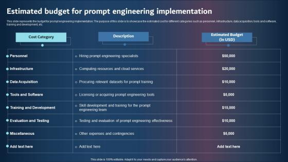 This slide represents the budget for prompt engineering implementation. The purpose of this slide is to showcase the estimated cost for different categories such as personnel, infrastructure, data acquisition, tools and software, training and development, etc. Make sure to capture your audiences attention in your business displays with our gratis customizable Estimated Budget For Prompt Engineering Implementation Rules Pdf. These are great for business strategies, office conferences, capital raising or task suggestions. If you desire to acquire more customers for your tech business and ensure they stay satisfied, create your own sales presentation with these plain slides. This slide represents the budget for prompt engineering implementation. The purpose of this slide is to showcase the estimated cost for different categories such as personnel, infrastructure, data acquisition, tools and software, training and development, etc.