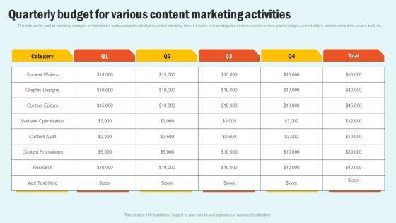 This slide can be used by marketing managers or finance team to allocate quarterly budget to content marketing team. It incudes various categories which are, content writers ,graphic designs, content editors, website optimization, content audit, etc. Retrieve professionally designed Quarterly Budget For Various Enhancing Website Performance With Search Engine Content Download Pdf to effectively convey your message and captivate your listeners. Save time by selecting pre made slideshows that are appropriate for various topics, from business to educational purposes. These themes come in many different styles, from creative to corporate, and all of them are easily adjustable and can be edited quickly. Access them as PowerPoint templates or as Google Slides themes. You do not have to go on a hunt for the perfect presentation because Slidegeeks got you covered from everywhere. This slide can be used by marketing managers or finance team to allocate quarterly budget to content marketing team. It incudes various categories which are, content writers ,graphic designs, content editors, website optimization, content audit, etc.
