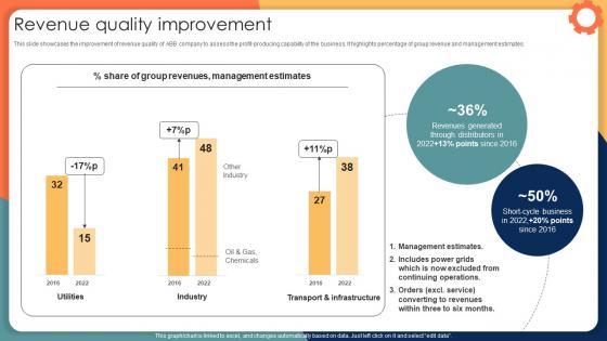 This slide showcases the improvement of revenue quality of ABB company to assess the profit-producing capability of the business. It highlights percentage of group revenue and management estimates. Take your projects to the next level with our ultimate collection of Revenue Quality Improvement Engineering Solution Provider Company Profile CP SS V. Slidegeeks has designed a range of layouts that are perfect for representing task or activity duration, keeping track of all your deadlines at a glance. Tailor these designs to your exact needs and give them a truly corporate look with your own brand colors they will make your projects stand out from the rest This slide showcases the improvement of revenue quality of ABB company to assess the profit-producing capability of the business. It highlights percentage of group revenue and management estimates.