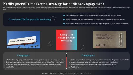This slide showcases guerrilla marketing strategy adopted by Netflix to promote content through unconventional forms of advertisement. This technique have helped Netflix to engage with customers and increase awareness about brand Do you have to make sure that everyone on your team knows about any specific topic I yes, then you should give Netflix Guerrilla Marketing Strategy For Audience Engagement Enhancing Online Visibility Themes Pdf a try. Our experts have put a lot of knowledge and effort into creating this impeccable Netflix Guerrilla Marketing Strategy For Audience Engagement Enhancing Online Visibility Themes Pdf You can use this template for your upcoming presentations, as the slides are perfect to represent even the tiniest detail. You can download these templates from the Slidegeeks website and these are easy to edit. So grab these today. This slide showcases guerrilla marketing strategy adopted by Netflix to promote content through unconventional forms of advertisement. This technique have helped Netflix to engage with customers and increase awareness about brand