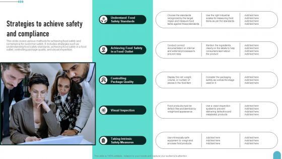 This slide covers various methods for achieving food safety and compliance for customer safety. It includes strategies such as understanding food safety standards, achieving food safety in a food outlet, controlling package quality, and visual inspection.Do you have to make sure that everyone on your team knows about any specific topic I yes, then you should give Strategies To Achieve Safety And Compliance Enhancing Global Presence Background Pdf a try. Our experts have put a lot of knowledge and effort into creating this impeccable Strategies To Achieve Safety And Compliance Enhancing Global Presence Background Pdf. You can use this template for your upcoming presentations, as the slides are perfect to represent even the tiniest detail. You can download these templates from the Slidegeeks website and these are easy to edit. So grab these today. This slide covers various methods for achieving food safety and compliance for customer safety. It includes strategies such as understanding food safety standards, achieving food safety in a food outlet, controlling package quality, and visual inspection.