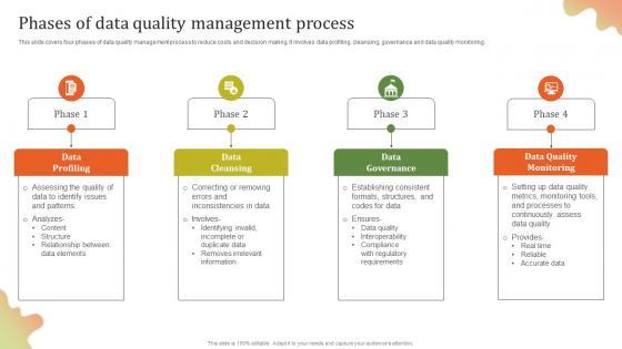 This slide covers four phases of data quality management process to reduce costs and decision making. It involves data profiling, cleansing, governance and data quality monitoring. Boost your pitch with our creative Phases Of Data Quality Management Executing Effective Quality Enhancement Clipart Pdf. Deliver an awe inspiring pitch that will mesmerize everyone. Using these presentation templates you will surely catch everyones attention. You can browse the ppts collection on our website. We have researchers who are experts at creating the right content for the templates. So you do not have to invest time in any additional work. Just grab the template now and use them. This slide covers four phases of data quality management process to reduce costs and decision making. It involves data profiling, cleansing, governance and data quality monitoring.