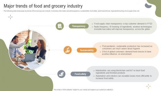The following slide showcases key trends of food and grocery industry. It provides information about transparency, sustainability, food safety, plant based foods, ingredients tracking, food supply chain, etc. Here you can discover an assortment of the finest PowerPoint and Google Slides templates. With these templates, you can create presentations for a variety of purposes while simultaneously providing your audience with an eye-catching visual experience. Download Implementing Strategies To Enhance Major Trends Of Food And Grocery Industry to deliver an impeccable presentation. These templates will make your job of preparing presentations much quicker, yet still, maintain a high level of quality. Slidegeeks has experienced researchers who prepare these templates and write high-quality content for you. Later on, you can personalize the content by editing the Implementing Strategies To Enhance Major Trends Of Food And Grocery Industry. The following slide showcases key trends of food and grocery industry. It provides information about transparency, sustainability, food safety, plant based foods, ingredients tracking, food supply chain, etc.