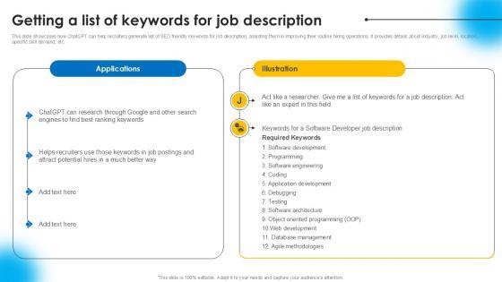 This slide showcases how ChatGPT can help recruiters generate list of SEO friendly keywords for job description, assisting them in improving their routine hiring operations. It provides details about industry, job level, location, specific skill demand, etc.Formulating a presentation can take up a lot of effort and time, so the content and message should always be the primary focus. The visuals of the PowerPoint can enhance the presenters message, so our Getting A List Of Keywords For AI Powered Recruitment Enhancing Ppt Presentation AI SS V was created to help save time. Instead of worrying about the design, the presenter can concentrate on the message while our designers work on creating the ideal templates for whatever situation is needed. Slidegeeks has experts for everything from amazing designs to valuable content, we have put everything into Getting A List Of Keywords For AI Powered Recruitment Enhancing Ppt Presentation AI SS V This slide showcases how ChatGPT can help recruiters generate list of SEO friendly keywords for job description, assisting them in improving their routine hiring operations. It provides details about industry, job level, location, specific skill demand, etc.