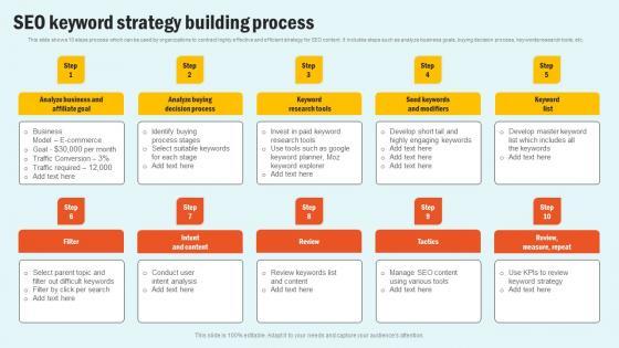 This slide shows 10 steps process which can be used by organizations to contract highly effective and efficient strategy for SEO content. It includes steps such as analyze business goals, buying decision process, keywords research tools, etc. Want to ace your presentation in front of a live audience Our SEO Keyword Strategy Building Enhancing Website Performance With Search Engine Content Information Pdf can help you do that by engaging all the users towards you. Slidegeeks experts have put their efforts and expertise into creating these impeccable powerpoint presentations so that you can communicate your ideas clearly. Moreover, all the templates are customizable, and easy to edit and downloadable. Use these for both personal and commercial use. This slide shows 10 steps process which can be used by organizations to contract highly effective and efficient strategy for SEO content. It includes steps such as analyze business goals, buying decision process, keywords research tools, etc.