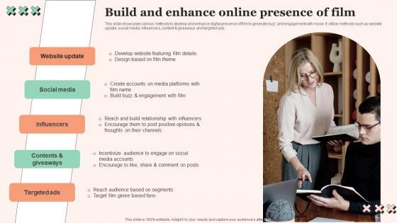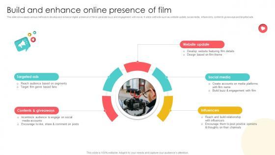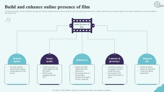 This slide showcases various methods to develop and enhance digital presence of film to generate buzz and engagement with movie. It utilize methods such as website update, social media, influencers, content and giveaways and targeted ads. There are so many reasons you need a Build And Enhance Online Presence Of Film Strategic Plan To Increase Film Ppt Slides Strategy SS V. The first reason is you can not spend time making everything from scratch, Thus, Slidegeeks has made presentation templates for you too. You can easily download these templates from our website easily. This slide showcases various methods to develop and enhance digital presence of film to generate buzz and engagement with movie. It utilize methods such as website update, social media, influencers, content and giveaways and targeted ads.