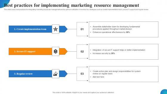 This slide covers best practices for integrating marketing resources management and its optimum utilization. It involves key strategies such as create implementation team, secure IT support and regular review. Create an editable Best Practices For Implementing Marketing Resource Management MDSS For Enhanced Themes Pdf that communicates your idea and engages your audience. Whether you are presenting a business or an educational presentation, pre-designed presentation templates help save time. Best Practices For Implementing Marketing Resource Management MDSS For Enhanced Themes Pdf is highly customizable and very easy to edit, covering many different styles from creative to business presentations. Slidegeeks has creative team members who have crafted amazing templates. So, go and get them without any delay. This slide covers best practices for integrating marketing resources management and its optimum utilization. It involves key strategies such as create implementation team, secure IT support and regular review.