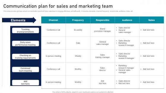 This slide provides glimpse about communication plan that helps sales team to engage effectively and efficiently. It includes elements, channel, frequency, responsible, audience, notes, etc. From laying roadmaps to briefing everything in detail, our templates are perfect for you. You can set the stage with your presentation slides. All you have to do is download these easy-to-edit and customizable templates. Communication Plan For Sales And Marketing Strategic Sales Plan To Enhance Information Pdf will help you deliver an outstanding performance that everyone would remember and praise you for. Do download this presentation today. This slide provides glimpse about communication plan that helps sales team to engage effectively and efficiently. It includes elements, channel, frequency, responsible, audience, notes, etc.