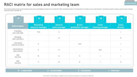 This slide provides glimpse about assigning roles and responsibilities to sales team members for better reporting structure. It includes team members such as sales director, marketing research manager, general sales manager, brand promotion manager, etc. Retrieve professionally designed RACI Matrix For Sales And Marketing Team Strategic Sales Plan To Enhance Slides Pdf to effectively convey your message and captivate your listeners. Save time by selecting pre-made slideshows that are appropriate for various topics, from business to educational purposes. These themes come in many different styles, from creative to corporate, and all of them are easily adjustable and can be edited quickly. Access them as PowerPoint templates or as Google Slides themes. You do not have to go on a hunt for the perfect presentation because Slidegeeks got you covered from everywhere. This slide provides glimpse about assigning roles and responsibilities to sales team members for better reporting structure. It includes team members such as sales director, marketing research manager, general sales manager, brand promotion manager, etc.