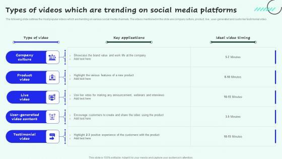 The following slide outlines the most popular videos which are trending on various social media channels. The videos mentioned in the slide are company culture, product, live, user generated and customer testimonial video.Here you can discover an assortment of the finest PowerPoint and Google Slides templates. With these templates, you can create presentations for a variety of purposes while simultaneously providing your audience with an eye catching visual experience. Download Types Of Videos Which Are Trending On Social Media Strategies For Enhancing Sales And Themes Pdf to deliver an impeccable presentation. These templates will make your job of preparing presentations much quicker, yet still, maintain a high level of quality. Slidegeeks has experienced researchers who prepare these templates and write high quality content for you. Later on, you can personalize the content by editing the Types Of Videos Which Are Trending On Social Media Strategies For Enhancing Sales And Themes Pdf. The following slide outlines the most popular videos which are trending on various social media channels. The videos mentioned in the slide are company culture, product, live, user generated and customer testimonial video.