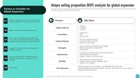 This slide covers the unique selling proposition of the fast food business. It includes factors such as target audience, competition, unique features, strengths, weaknesses, benefits, USP statement.Slidegeeks is here to make your presentations a breeze with Unique Selling Proposition USP Analysis Enhancing Global Presence Graphics Pdf With our easy-to-use and customizable templates, you can focus on delivering your ideas rather than worrying about formatting. With a variety of designs to choose from, you are sure to find one that suits your needs. And with animations and unique photos, illustrations, and fonts, you can make your presentation pop. So whether you are giving a sales pitch or presenting to the board, make sure to check out Slidegeeks first. This slide covers the unique selling proposition of the fast food business. It includes factors such as target audience, competition, unique features, strengths, weaknesses, benefits, USP statement.