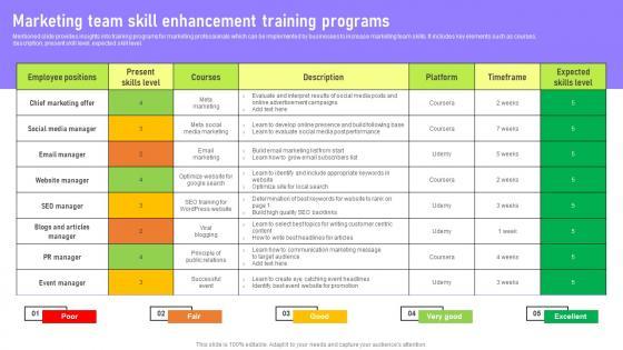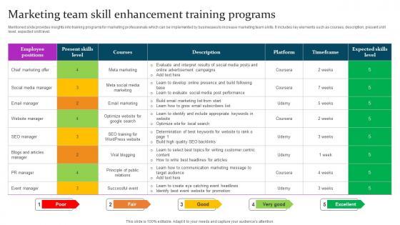 Mentioned slide provides insights into training programs for marketing professionals which can be implemented by businesses to increase marketing team skills. It includes key elements such as courses, description, present skill level, expected skill level. Slidegeeks has constructed Marketing Team Skill Enhancement Deployment Of Marketing Communication Rules Pdf after conducting extensive research and examination. These presentation templates are constantly being generated and modified based on user preferences and critiques from editors. Here, you will find the most attractive templates for a range of purposes while taking into account ratings and remarks from users regarding the content. This is an excellent jumping off point to explore our content and will give new users an insight into our top notch PowerPoint Templates. Mentioned slide provides insights into training programs for marketing professionals which can be implemented by businesses to increase marketing team skills. It includes key elements such as courses, description, present skill level, expected skill level.